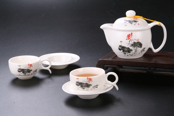 | 產(chǎn)品名稱:玉脂瓷荷塘月色小古壺雙杯碟組 |