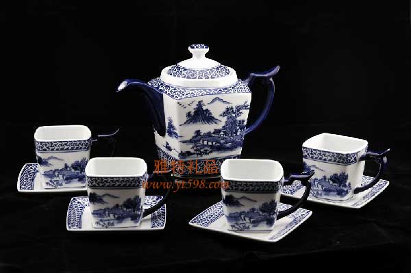 | 產(chǎn)品名稱:春江飛燕青花瓷四角咖啡具 |