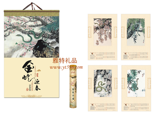 | 產(chǎn)品名稱:2013掛軸式大度對開十三張?zhí)籽b古典絹畫雙月歷 |